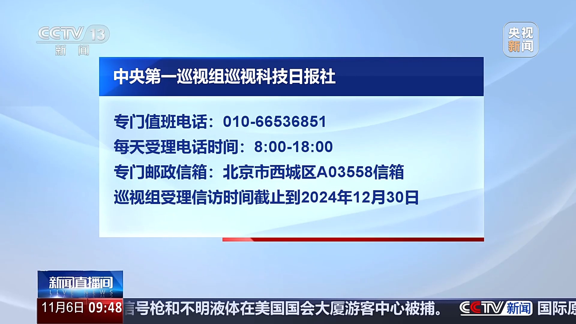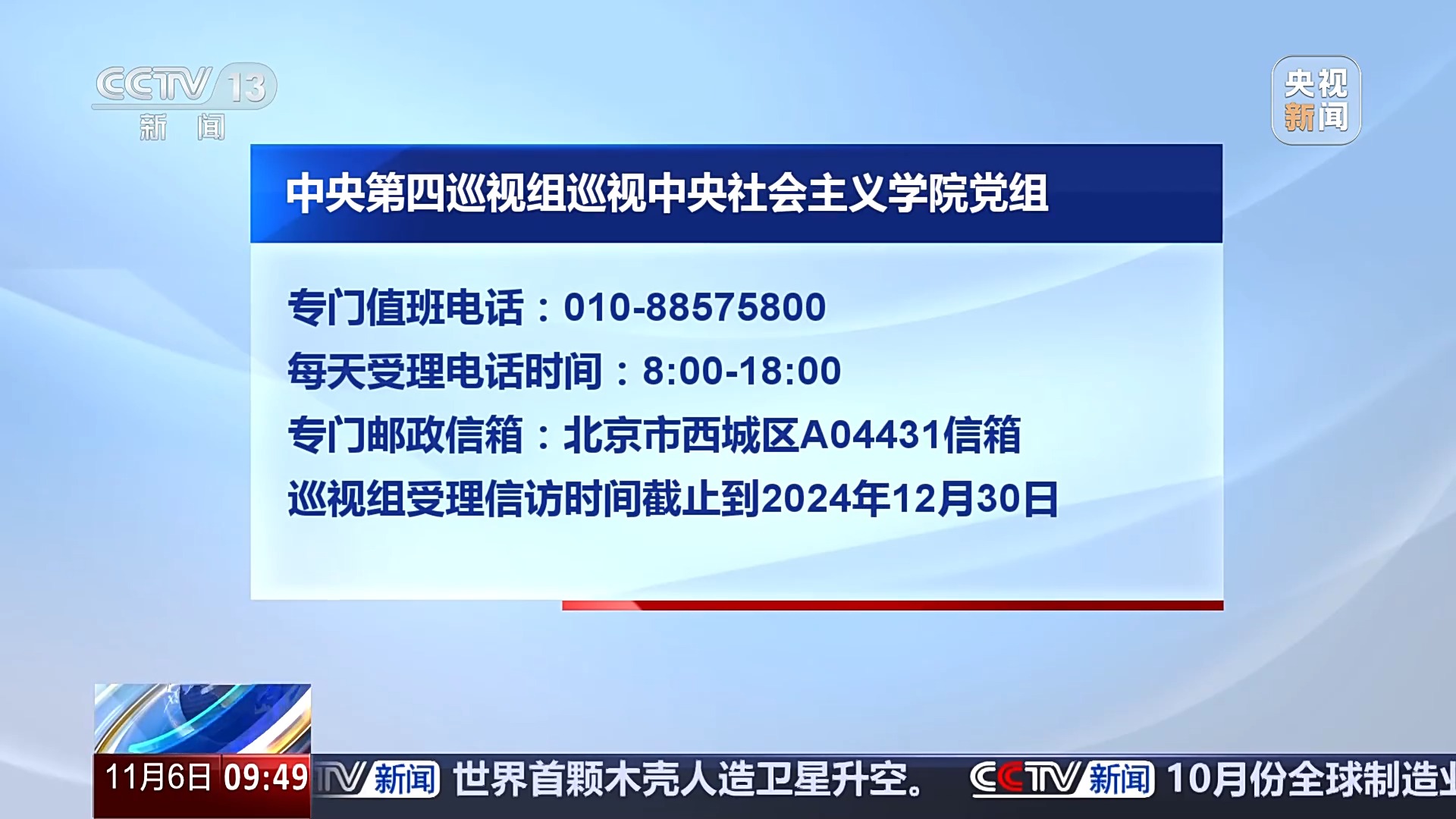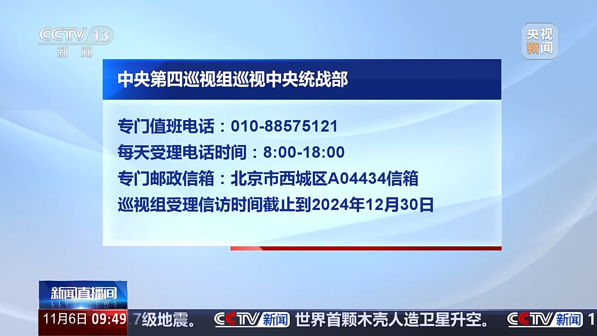 中央第四巡視組組長陳學東在進駐現場指出,巡視是重要的政治工作,肩負“兩個維護”的重大政治責任。中央巡視組將深入貫徹黨的二十大和二十屆二中、三中全會精神,認真落實二十屆中央紀委三次全會部署,全面貫徹巡視工作方針,精準有效開展政治監督。根據巡視工作條例規定,中央巡視組主要受理反映被巡視單位黨組織領導班子及其成員、下一級黨組織主要負責人和重點崗位人員問題的來信來電來訪,重點是關於違反政治紀律、組織紀律、廉潔紀律、羣眾紀律、工作紀律和生活紀律等方面的舉報和反映。
