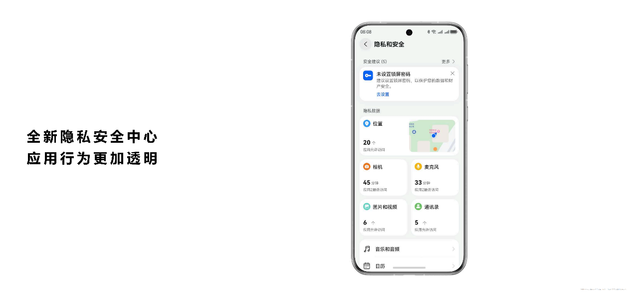 隱私安全中心則為用户提供了一個一站式管理數據的平台。在這裏,用户可以清晰地看到哪些應用訪問了哪些權限,以及訪問的時長和頻次。隱私安全中心還支持按照權限類型篩選應用,幫助用户更加方便地管理應用的權限情況。如果遇到不合理的權限請求,用户可以一鍵關閉。此外,隱私安全中心還會基於用户的用機情況提供場景化的隱私保護建議,如未開啓電話攔截騷擾等風險提示,讓用户的隱私管理更加智能便捷。