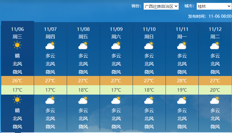 桂林未來幾日天氣預報。數據來源:中央氣象台
