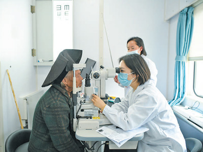 醫生在健康列車上為村民進行眼科檢查。