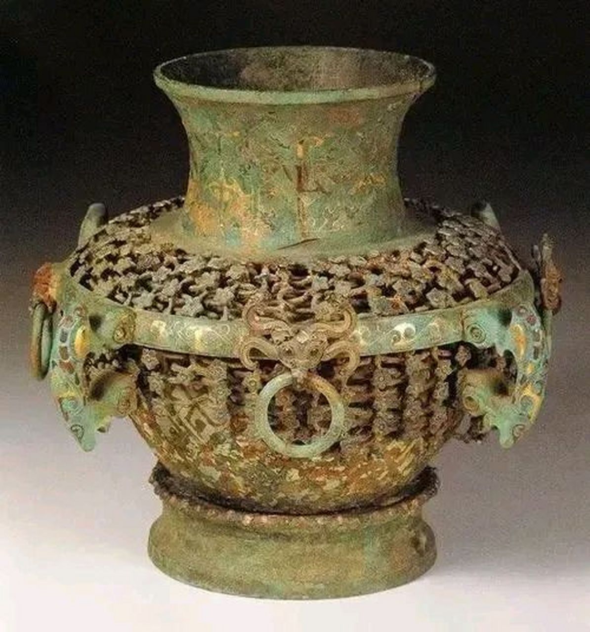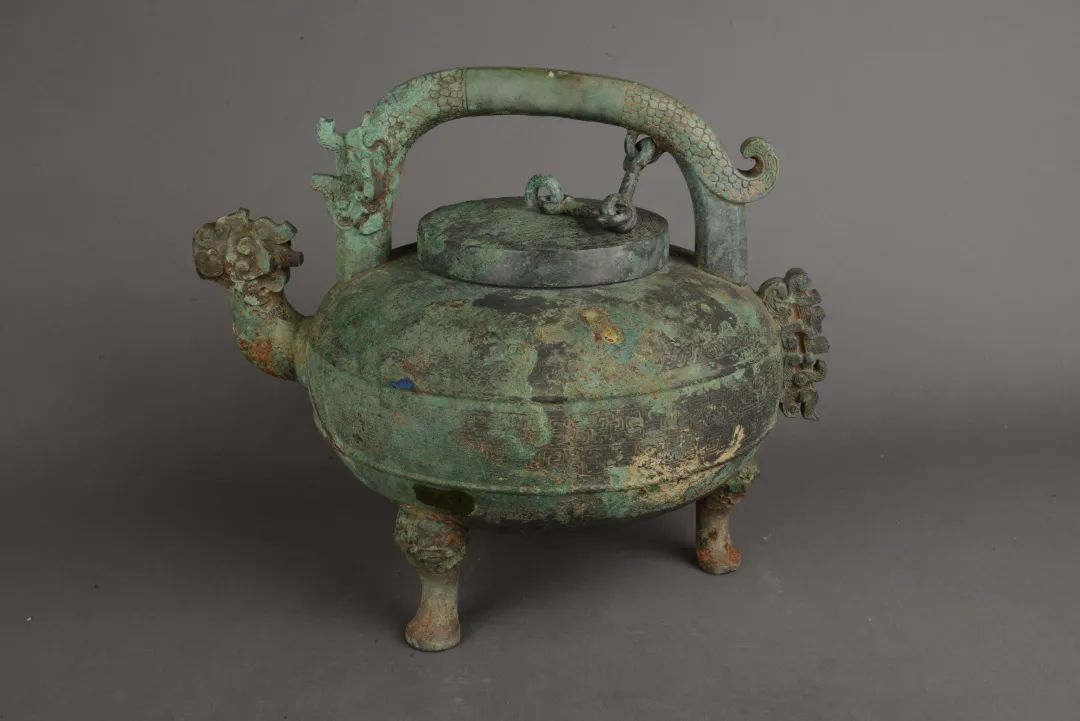 雙獸首三輪青銅盤是盥洗用的水器,聰明的工匠在盤的矮圈安裝三個可以轉動的輪子,前輪兩側各有一由底向上伸出的獸首,回首折向盤內,成為獨具匠心的曠世之作。南京博物院收藏的戰國錯金銀鑲嵌絲網套銅壺也是青銅重器,此壺又名“陳璋圓壺”,1982年出土於盱眙南窯莊。陳璋圓壺是一名齊國將軍伐燕獲得的戰利品,用兩條蟠龍交叉形成透空的青銅器紋飾,表面錯金銀紋飾極為華麗,結構非常複雜,與曾侯乙盤尊有異曲同工之妙,可謂先秦透空蟠龍紋青銅器的巔峯之作。