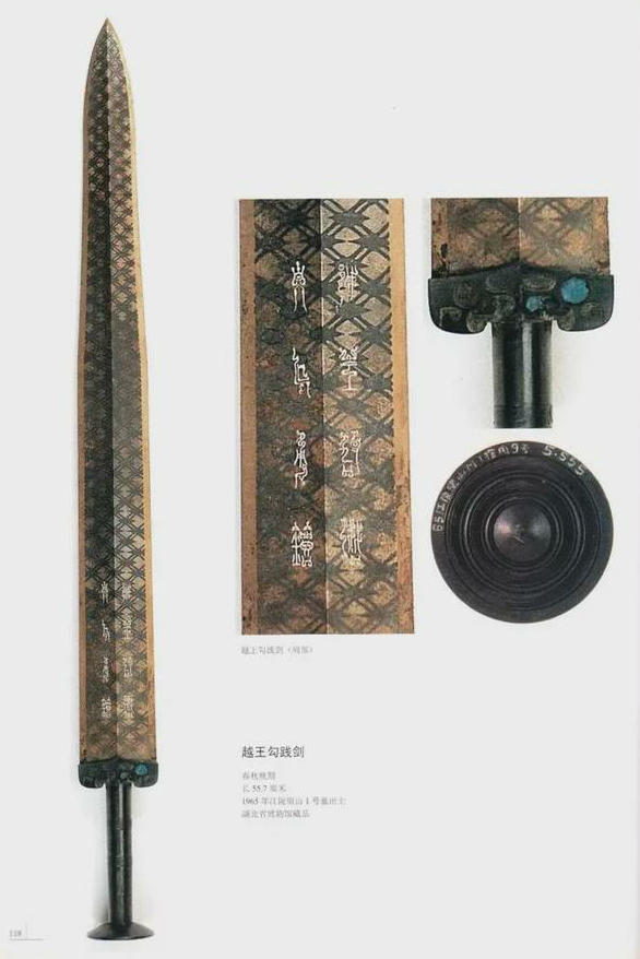 此劍1965年出土於湖北江陵望山1號墓,墓主可能是戰國中期的楚國貴族悼固。越王勾踐劍的劍首向外翻卷作圓箍形,內鑄有極其精細的11道同心圓,劍格正面用藍色琉璃、背面用綠松石鑲嵌成美麗的紋飾,劍身滿飾黑色菱形幾何花紋。在劍身近格處有兩行八字的鳥篆銘文:“越王鳩淺自作用劍”。“鳩淺”即“勾踐”,説明它是越王勾踐的自用青銅劍,雖深埋於地下2400多年,出鞘時劍身仍寒光閃閃,毫無鏽蝕。