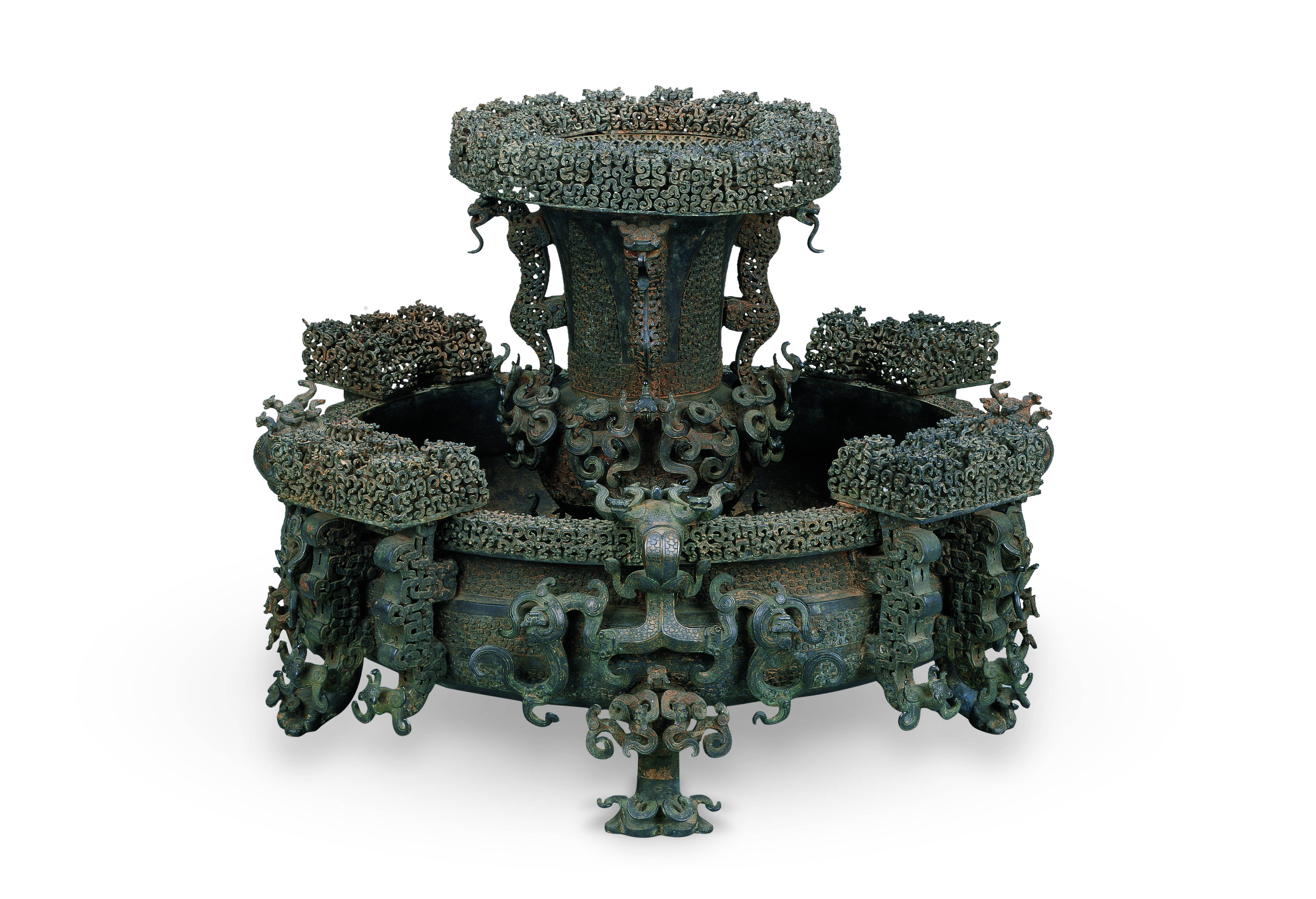 *曾攀:*曾國青銅器和楚國青銅器以工藝精美、紋飾繁複而著稱。出土於曾侯乙墓的曾侯乙尊盤是一套酒器,尊口、盤口和4個摳手均採用失蠟法鑄造,做成細密繁複、玲瓏剔透的鏤空紋飾。尊的頸部有4條圓雕的龍形裝飾,它們頭部向外,口吐長舌,身體也是由鏤空紋飾組成。尊體使用了34個部件,通過56處鑄焊連成一體,造型、裝飾、設計可謂鬼斧神工,是戰國時期青銅工藝的巔峯之作。