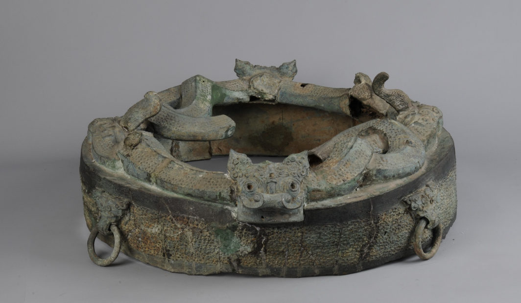出土於舒城九里墩春秋墓的龍虎紋四環銅鼓座則是一件和鍾離國有關的青銅器,根據鼓座上的銘文分析,此物為鍾離公自用之器,是建鼓的鼓座。建鼓在古代常用於戰爭、祭祀、娛樂等場合,兩個鼓手相對敲擊,在戰場上指揮軍隊進退。