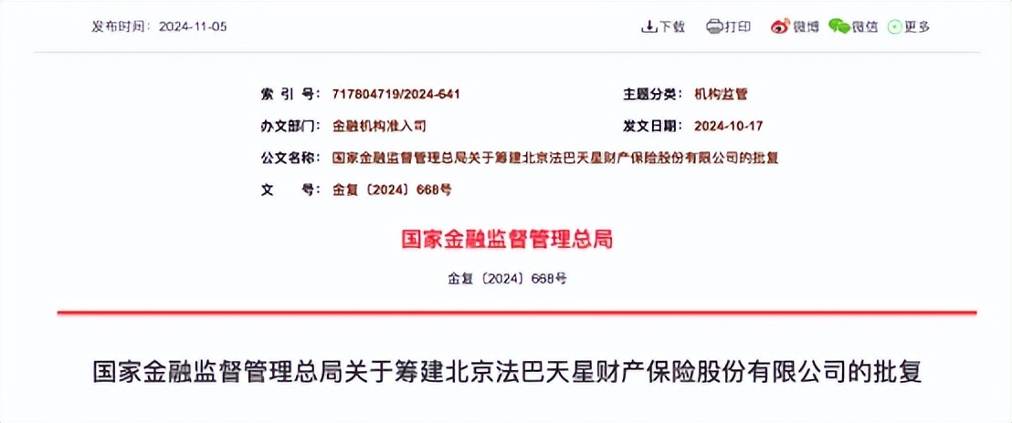 【環球網財經綜合報道】國家金融監管總局於11月5日在其官網公佈行政許可信息,披露該局已於10月17日正式同意籌建北京法巴天星財產保險股份有限公司(簡稱“北京法巴天星財險”)。