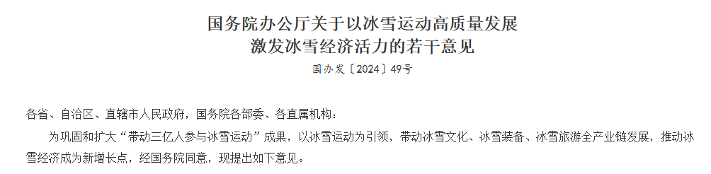 國務院辦公廳日前印發*《關於以冰雪運動高質量發展激發冰雪經濟活力的若干意見》* (以下簡稱《意見》),旨在鞏固和擴大“帶動三億人蔘與冰雪運動”成果,以冰雪運動為引領,帶動冰雪文化、冰雪裝備、冰雪旅遊全產業鏈發展,推動冰雪經濟成為新增長點。