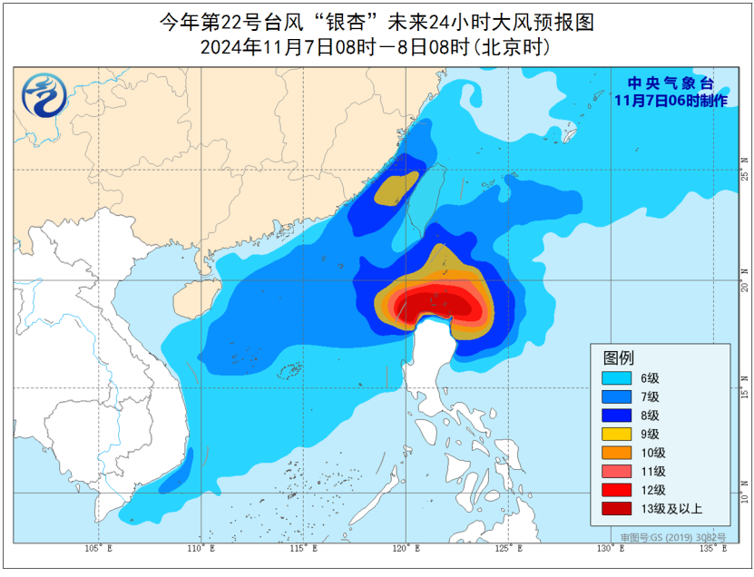 *大風預報:*7日08時至8日08時,東海大部、台灣海峽、台灣以東洋麪、南海大部、巴士海峽、浙江沿海、福建沿海、台灣島沿海、廣東東部沿海、海南島東部沿海有6-8級、陣風9-10級的大風,其中巴士海峽、台灣海峽、南海東北部的部分海域的風力可達9-10級、陣風11-12級,巴士海峽南部海域將有11-13級、陣風14-15級的大風,“銀杏”中心經過的附近海域或地區風力可達14-17級,陣風17級以上。