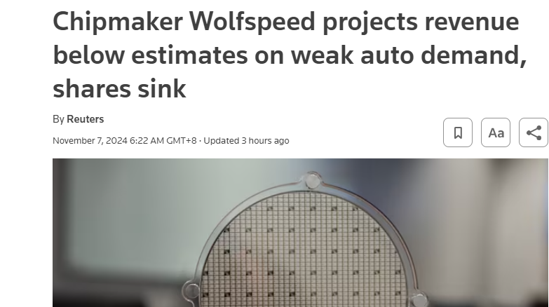 Wolfspeed預測收入低於預期,汽車需求疲軟致股價下跌