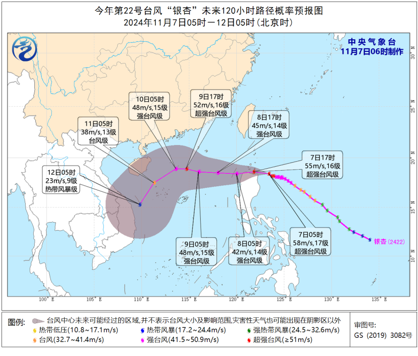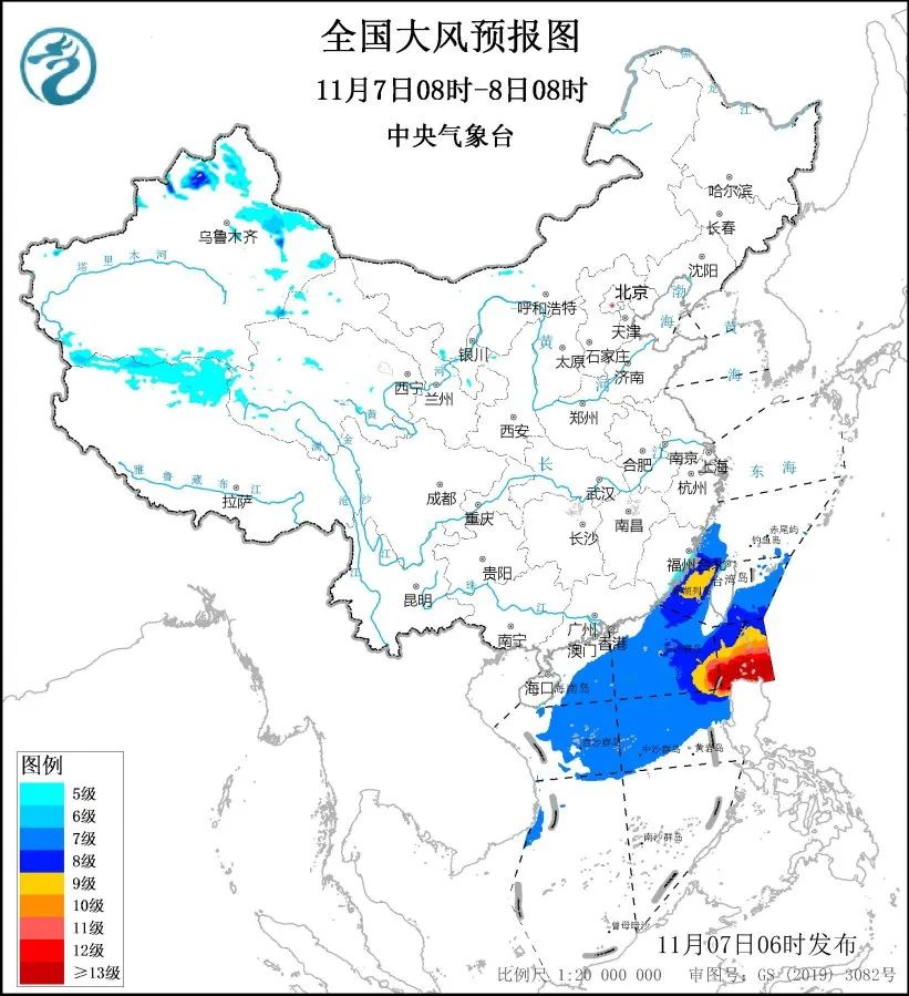 預計,11月7日08時至8日08時,新疆中北部、西藏北部、福建沿海、台灣島等地將有5至6級、陣風7至8級的大風,其中,新疆山口地區、福建沿海、台灣島東南部沿海有7至8級、陣風9至10級的大風;東海西南部海域、台灣海峽、台灣以東洋麪、南海北部和中部海域將有7至8級、陣風9至10級的大風,其中巴士海峽、台灣海峽、南海東北部部分海域的風力可達9至10級、陣風11至12級,巴士海峽將有11至13級、陣風14至15級的大風,颱風“銀杏”中心經過附近海域風力可達14至17級,陣風17級以上。