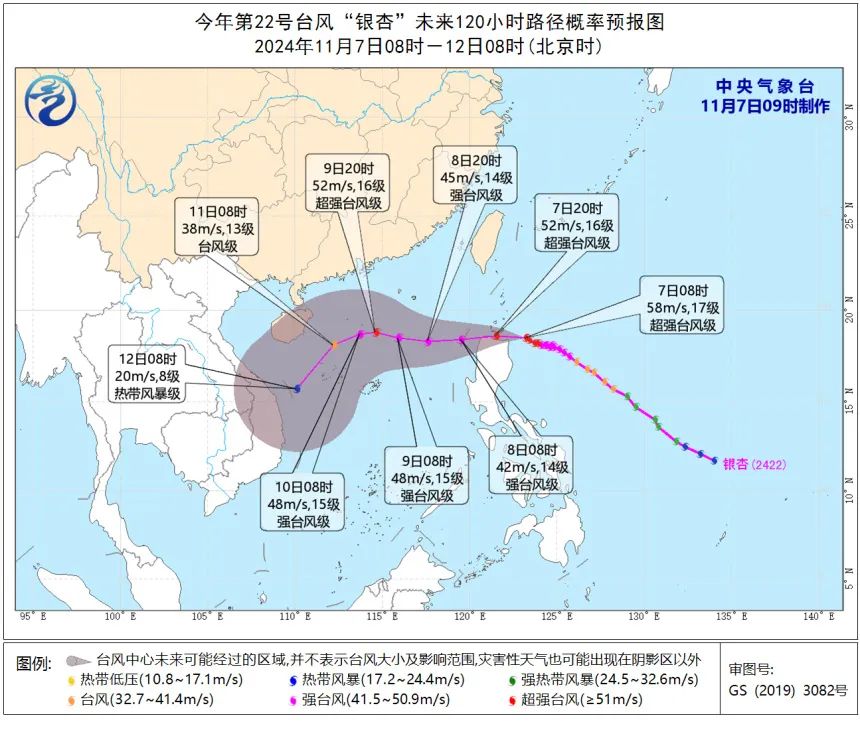*大風預報:*7日08時至8日08時,東海大部、台灣海峽、台灣以東洋麪、*南海大部、*巴士海峽、浙江沿海、福建沿海、台灣島沿海、廣東東部沿海、*海南島東部沿海有6至8級、陣風9至10級的大風,*其中巴士海峽、台灣海峽、*南海東北部的部分海域的風力可達9至10級、陣風11至12級,*巴士海峽南部海域將有11至13級、陣風14至15級的大風,“銀杏”中心經過的附近海域或地區風力可達14至17級,陣風17級以上。