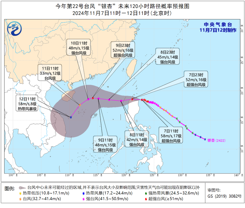 今年第22號颱風“銀杏”昨天夜間由強颱風級加強為超強颱風級。據中央氣象台,最新預報顯示,“銀杏”將以每小時15公里左右速度向偏西方向移動,強度略有減弱,8日凌晨將登陸或擦過菲律賓呂宋島北部沿海(強颱風級或超強颱風級,14-16級,45-55m/s),之後移入南海東北部海面,強度再次增強!