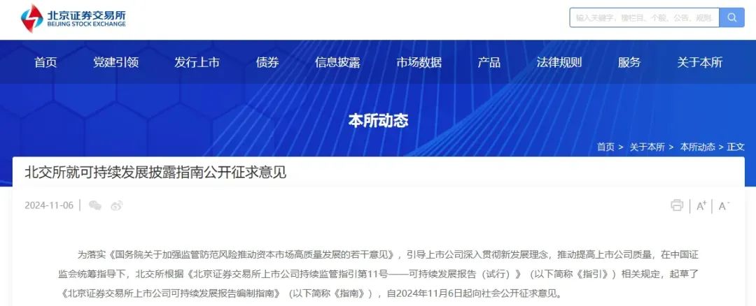 為落實《國務院關於加強監管防範風險推動資本市場高質量發展的若干意見》,引導上市公司深入貫徹新發展理念,推動提高上市公司質量,在中國證監會統籌指導下,北交所根據《北京證券交易所上市公司持續監管指引第11號——可持續發展報告(試行)》(以下簡稱《指引》)相關規定,起草了《北京證券交易所上市公司可持續發展報告編制指南》(以下簡稱《指南》),自2024年11月6日起向社會公開徵求意見。