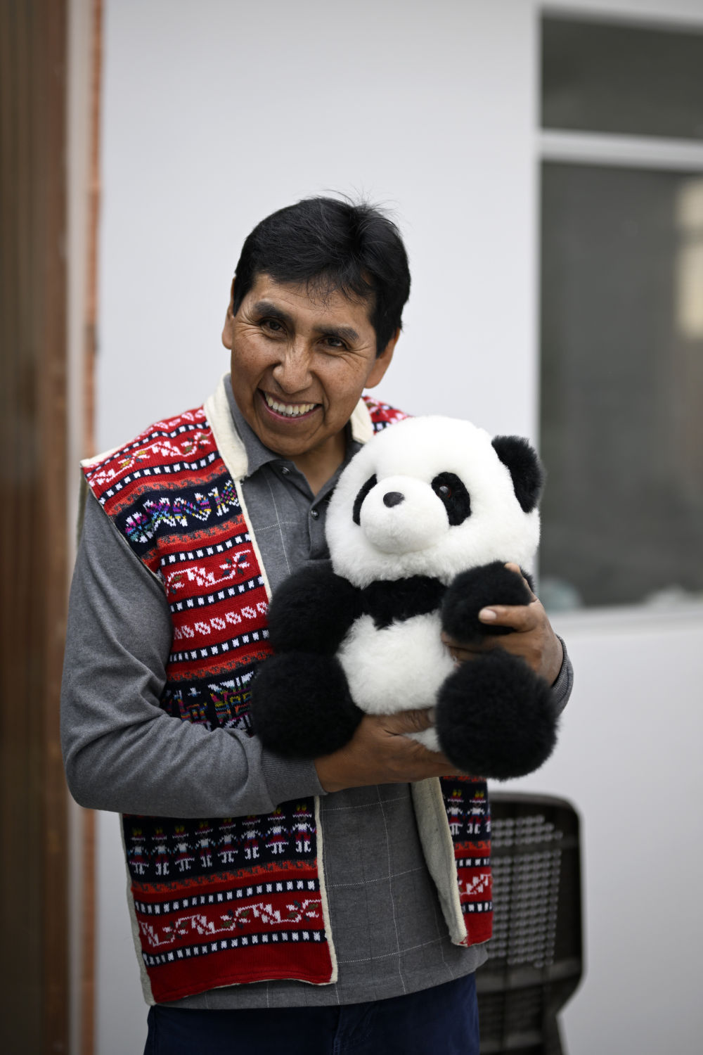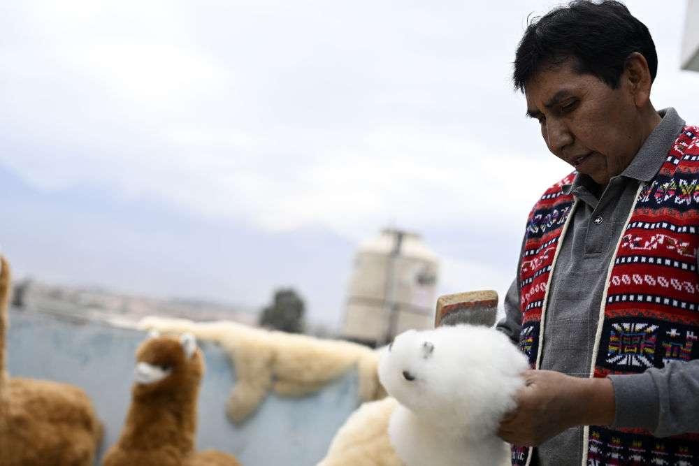 ↑羊駝毛製品手工藝人奧斯瓦爾多·馬馬尼在秘魯阿雷基帕展示羊駝毛製作的熊貓玩偶
