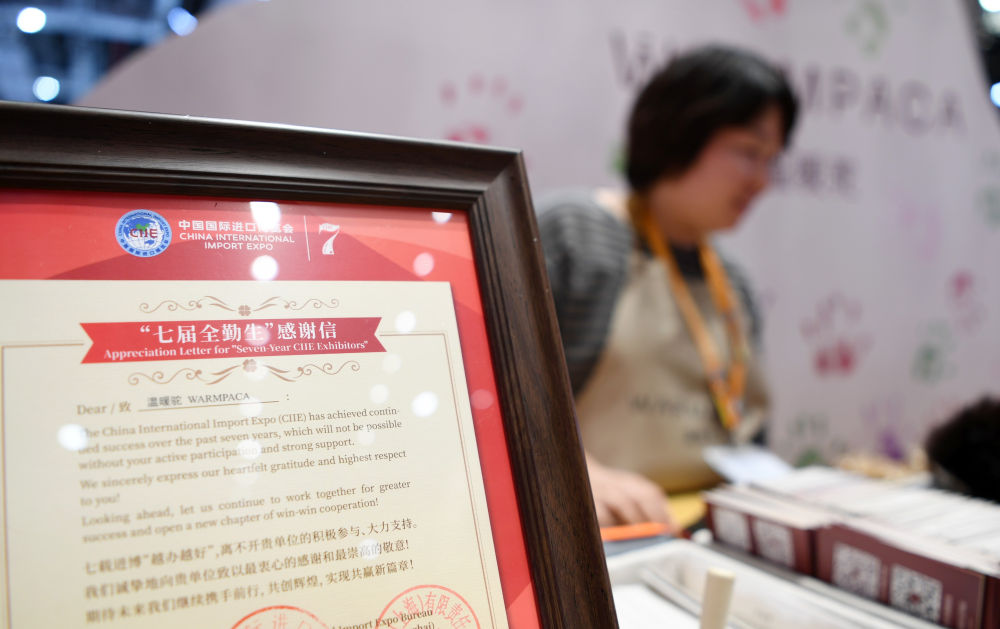↑第七屆進博會“温暖駝”展台上擺放着進博會“七屆全勤生”感謝信