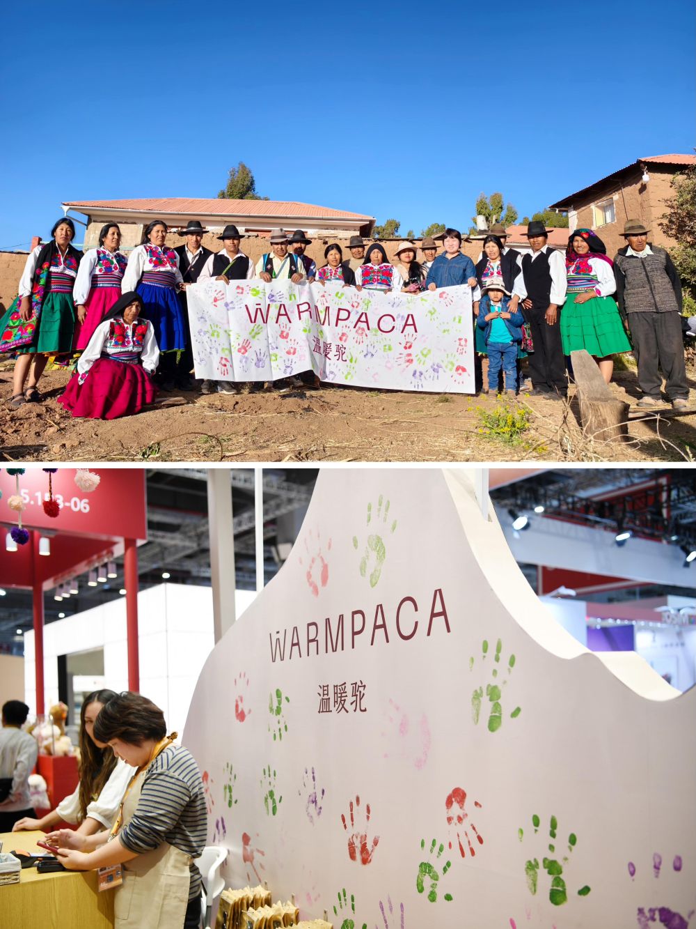 ↑第七屆進博會“温暖駝”展台一側裝飾牆印有秘魯手工藝人的彩色手印