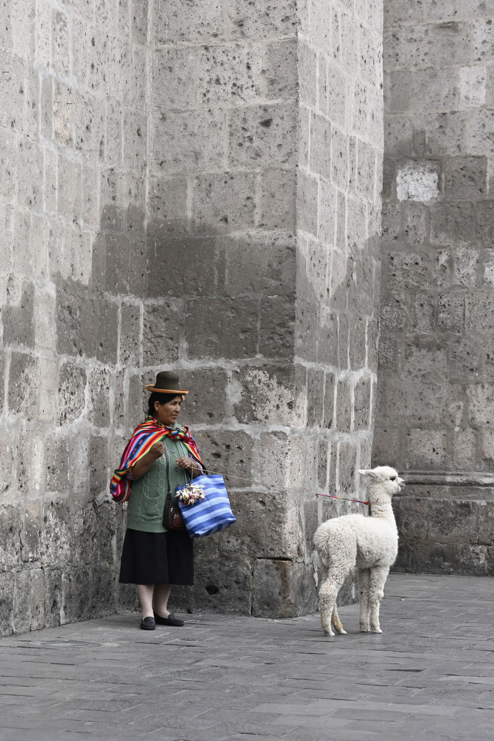 ↑一名身着傳統服裝的婦女在秘魯阿雷基帕牽着羊駝