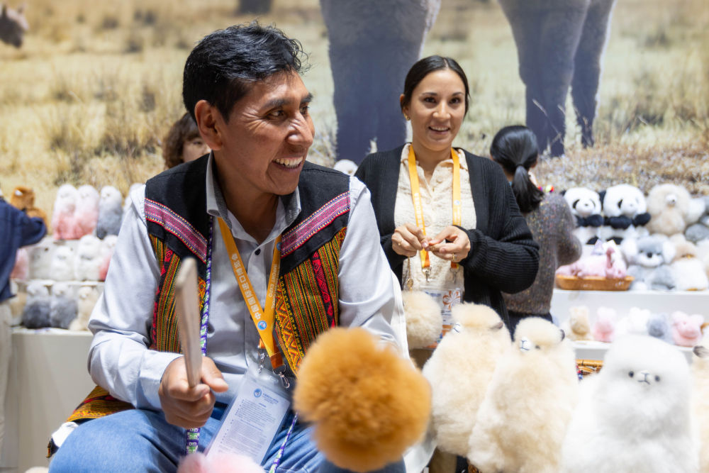 ↑羊駝毛製品手工藝人奧斯瓦爾多·馬馬尼(前)在第六屆進博會“温暖駝”品牌展台宣傳羊駝玩偶