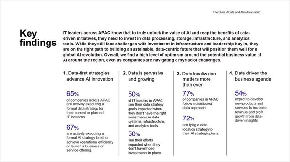 亞太地區的IT領導者們都認識到,戰略數據管理對於有效釋放人工智能的全部價值至關重要。 調研顯示,該地區65%的公司正在為當前或計劃中的IT位置積極執行正式的數據戰略,77%的亞太地區公司則採用分佈式數據方法來應對數據重力挑戰。