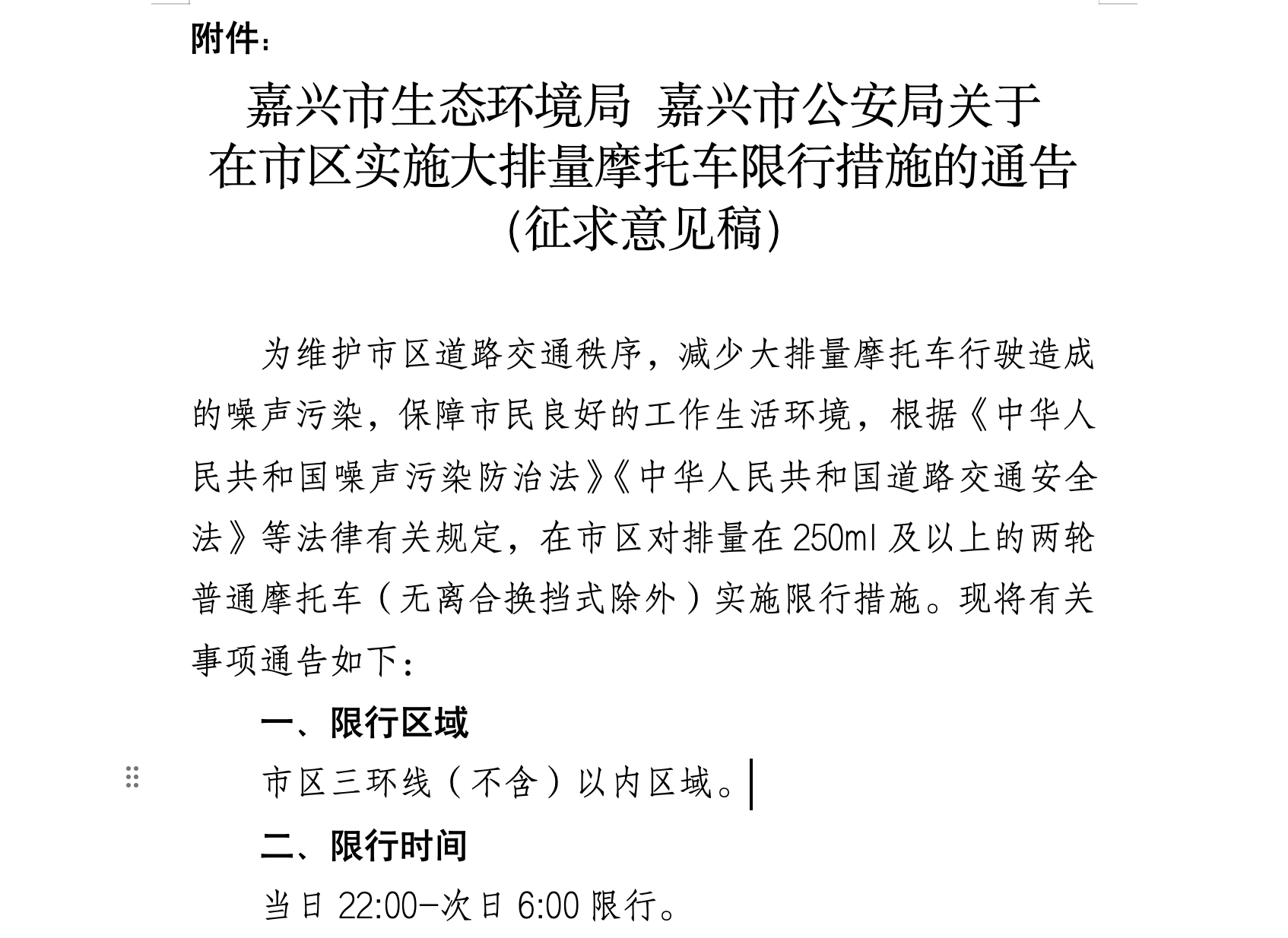 近日,浙江省嘉興市生態環境局、公安局對在市區實施大排量摩托車限行措施徵求意見。