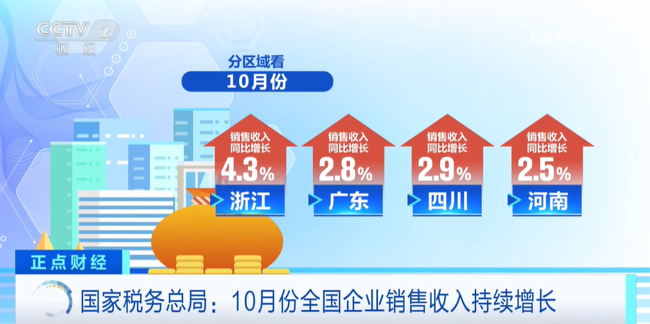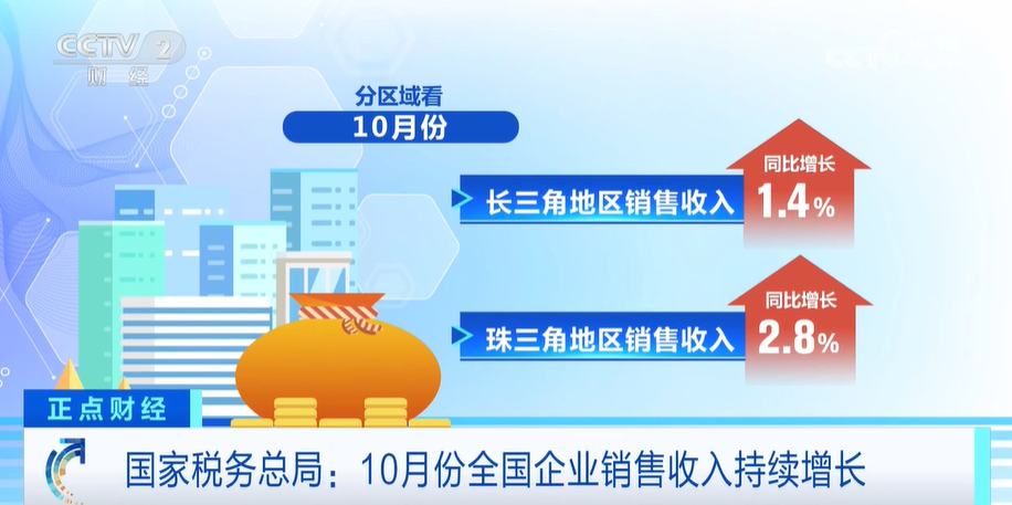 *央視網消息:*國家税務總局11月7日發佈的增值税發票數據顯示,10月份,全國企業銷售收入持續增長,較8、9月份分別提高3個和1.3個百分點。其中製造業、高技術服務業等領域增長較快。
