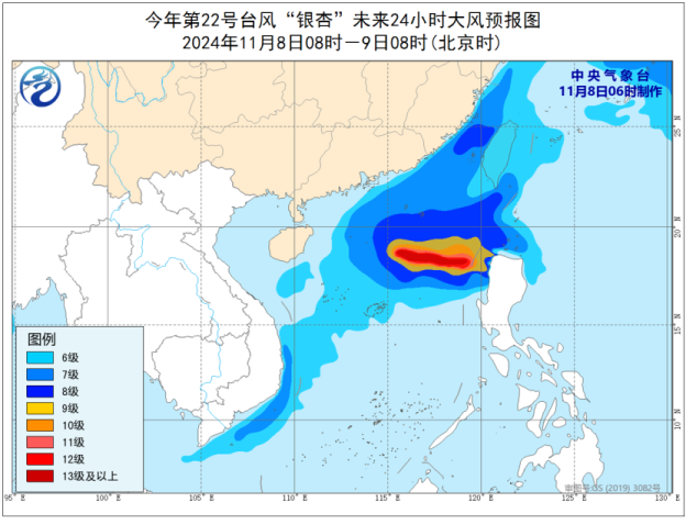 颱風“銀杏”已於昨天(11月7日)晚上在菲律賓呂宋島西北部沿海登陸,登陸時強度為超強颱風級(16級,52米/秒),今天凌晨減弱為強颱風級。目前“銀杏”已進入我國南海海域。預計,“銀杏”進入南海後強度將再次增強,最強可達強颱風級或超強颱風級(15~16級,48~52米/秒),並向西沙羣島附近海域靠近,給南海等帶來強風天氣。中央氣象台11月8日06時發佈颱風黃色預警*。*