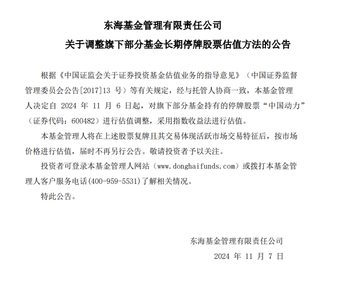 11月7日,東海基金髮布公告稱,自11月6日起,對旗下部分基金持有的停牌股票“中國動力”進行估值調整,採用指數收益法進行估值。此外,東海基金將在上述股票復牌且其交易體現活躍市場特徵後,按市場價格進行估值,屆時不再另行公告。