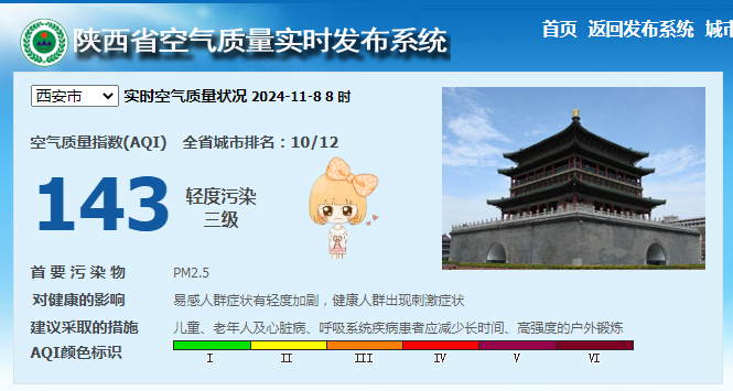 根據陝西省環境監測中心站與陝西省氣象台的預測預報及會商研判結果:8日至12日,關中地區氣壓場較弱,擴散條件持續轉差,預測西安市可能出現持續36小時及以上的中度污染風險,預計11月10日西安市AQI指數將達到125-155。