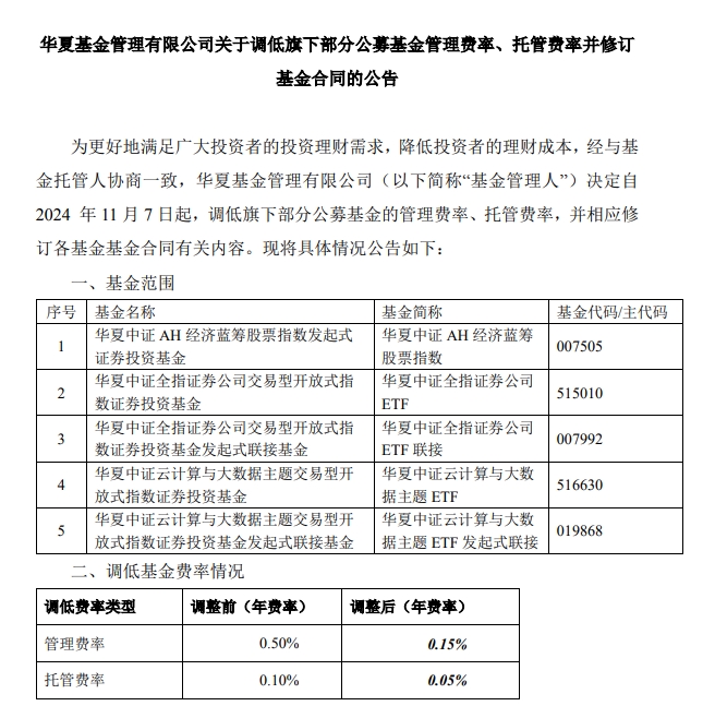 【環球網金融綜合報道】11月6日晚,華夏基金髮布公告稱,決定自11月7日調低旗下5只產品的管理費率、託管費率。