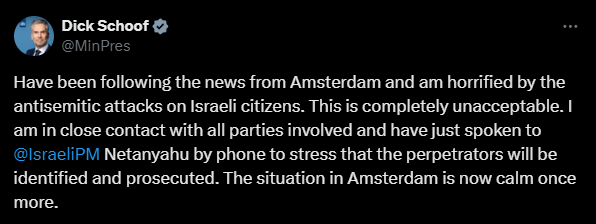 事件發生後,荷蘭首相迪克·斯霍夫在社交媒體上發帖表示,針對以色列公民的暴力行為是完全不可接受的。他“對發生在阿姆斯特丹的事件感到震驚”。斯霍夫還表示,他已與內塔尼亞胡通話,強調事件肇事者將被起訴。