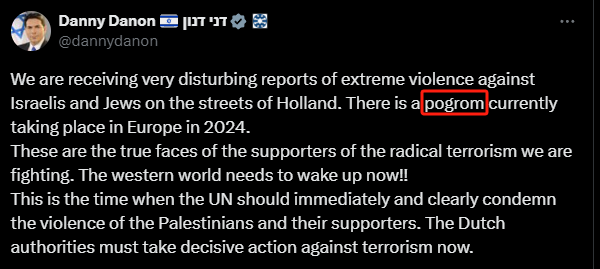 以色列常駐聯合國代表丹尼·達農則在社交媒體平台上譴責這起暴力行為是“大屠殺”(pogrom)。