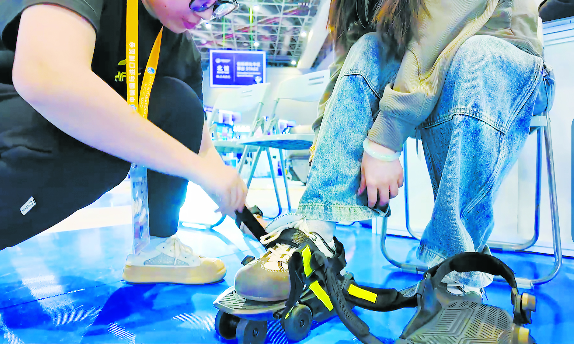 首度參展的美國瞬動科技公司帶來了世界上首款能讓人以跑步速度行走的智能動力鞋——踏月者。這款智能動力鞋外觀看上去就像一雙帶輪子的繫帶涼鞋,一隻卻足有1.9千克。但記者現場體驗發現,智能動力鞋穿在腳上走起來不僅省力,而且在滑行輪的助力下“行走如飛”。