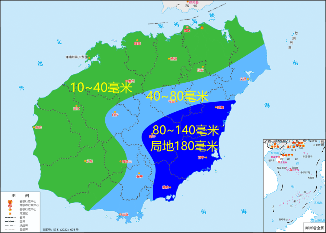 預計,10日8時至13日8時各地累積雨量:西沙和中沙羣島各島礁累積雨量100~150毫米。海南島瓊海、萬寧、瓊中和陵水等市縣80~140毫米、局地180毫米;文昌、屯昌、白沙、五指山、保亭和三亞等市縣40~80毫米;其餘市縣10~40毫米。