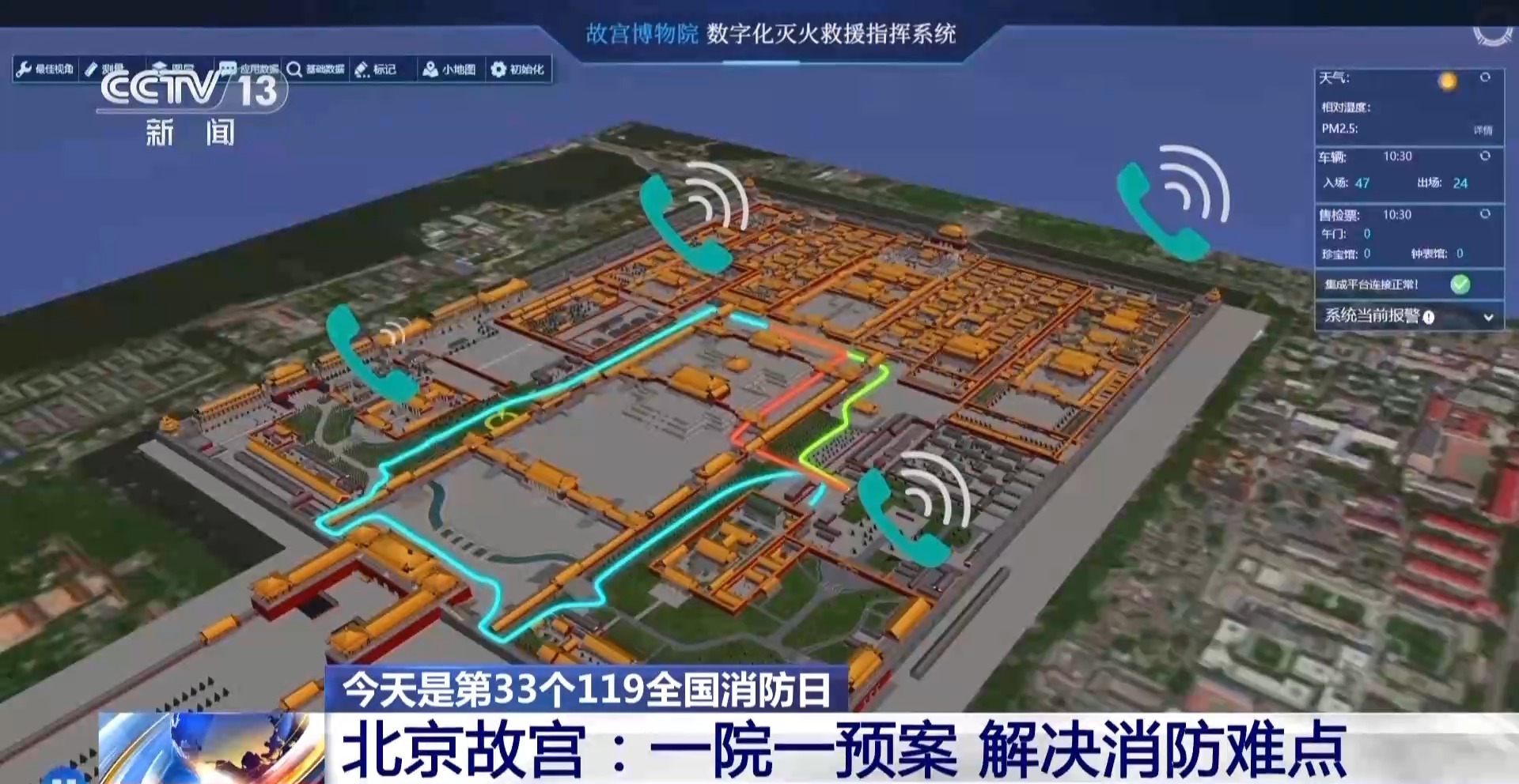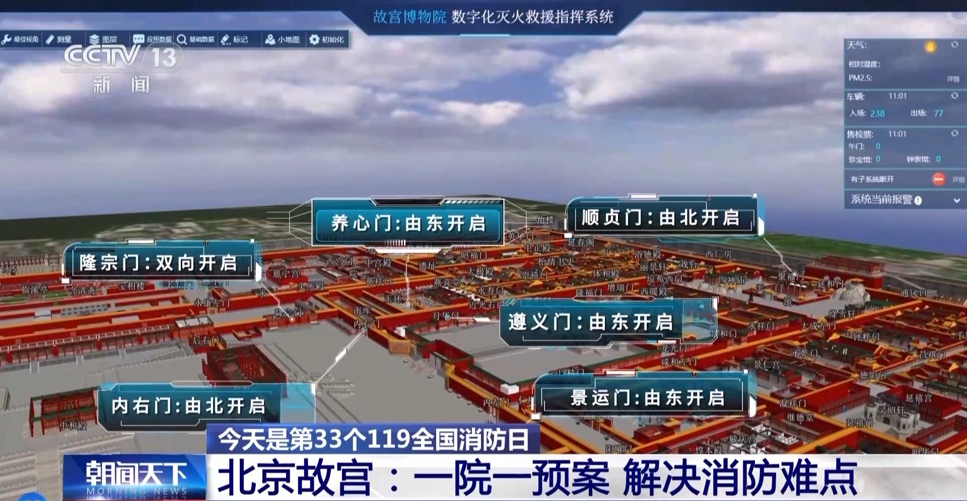 *北京消防故宮特勤站指導員 張肖:*在故宮這套數字化滅火救援指揮系統內,我們結合故宮的實際,設置了55處消防最不利點,像慈寧宮,我們細化了126套滅火救援預案,規劃了138條不同的進宮路線,3分鐘可以抵達故宮的任意角落。