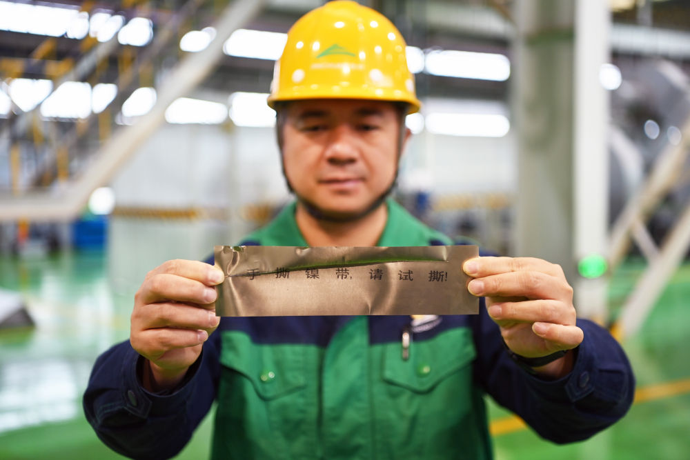 “這款超薄鎳帶厚度僅為0.05毫米,不到A4紙的一半,可以隨意彎曲、變形,輕輕用力就能撕破。”公司綜合管理部經理李羊介紹,相比“超薄純鎳帶材”這一學名,它還有個更為形象的名稱——手撕鎳。