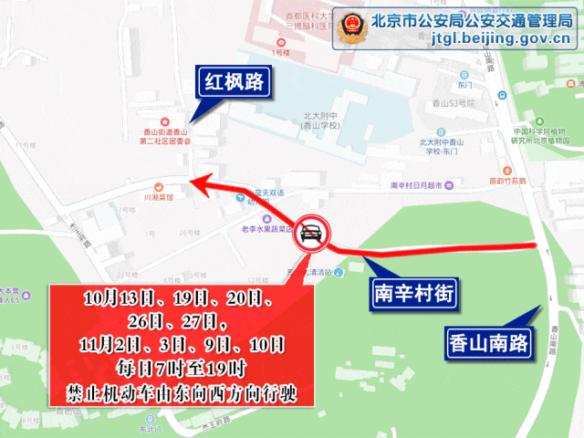 特別提示:香山紅葉觀賞季期間,遊客數量將大幅增加,為確保紅葉觀賞季期間香山地區的道路交通安全與暢通,*2024年11月9日、10日,每天7時至19時,*將對南辛村街(紅楓路至香山南路段)採取禁止機動車由東向西方向行駛的臨時交通管理措施。