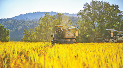 江西黎川縣的稻田裏,收割機在前,“吞”入一串串飽滿的稻穗;村民在後,將一簇簇稻草紮成稻草束,整齊地立在田裏晾曬。