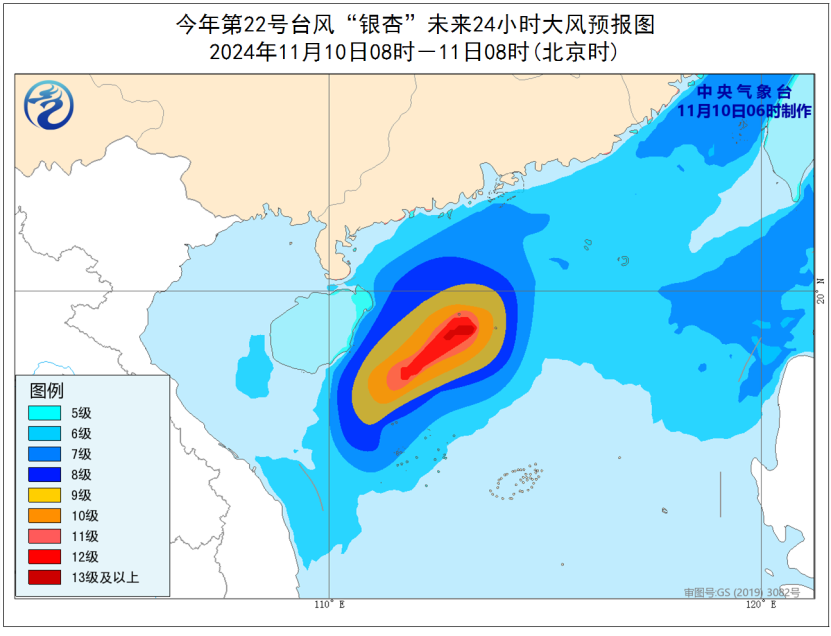 預計,10日08時至11日08時,受冷空氣和颱風“銀杏”的共同影響,台灣海峽、南海北部和中部、西沙羣島、海南島東部沿海、福建沿海、廣東沿海將有6-8級、陣風9-10級的大風,其中南海西北部和中西部的部分海域風力可達9-11級、陣風12-13級,“銀杏”中心經過的附近海域風力可達12-14級,陣風15-16級(見圖2)。