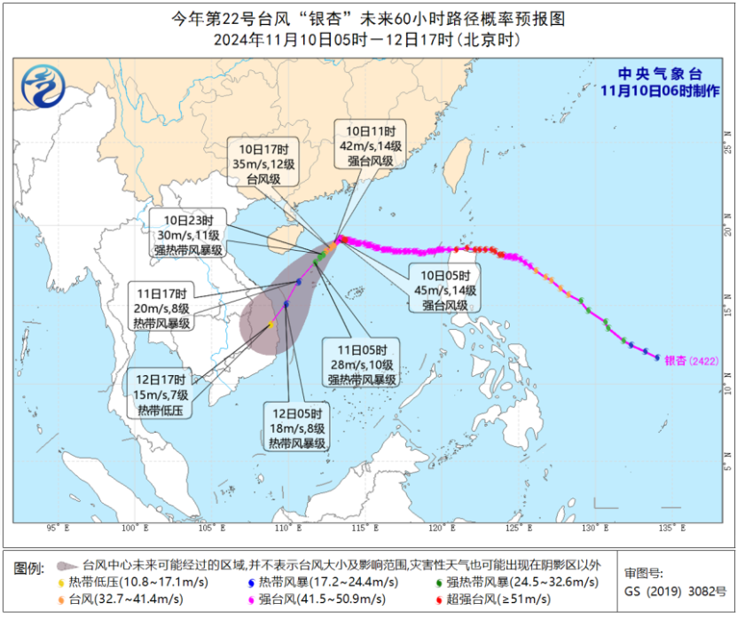 預計,“銀杏”將以每小時10公里左右的速度在海南島以東海面向西南方向移動,強度逐漸減弱,並趨向越南南部沿海(見圖1)。中央氣象台11月10日06時繼續發佈颱風黃色預警。