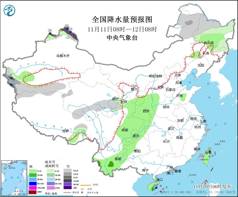 *11月11日08時至12日08時,*內蒙古東部、黑龍江西部、新疆北疆北部和南疆盆地、西藏西北部、青海東部和南部等地部分地區有小到中雪或雨夾雪,其中,新疆北疆北部和北疆東部等地部分地區有大到暴雪,局地大暴雪(20~26毫米)。黑龍江南部、新疆南疆盆地、甘肅東部、陝西中南部、四川盆地、雲南中部、海南島、台灣島等地部分地區有小到中雨,其中,海南島東部、台灣島北部等地部分地區有大雨(25~60毫米)(見圖4)。