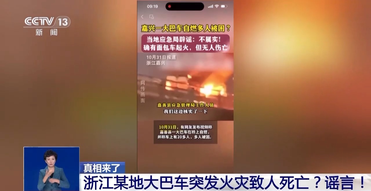 10月31日晚,有網民發佈視頻稱,浙江省嘉善縣一橋上突發火災,並配文“特大火災,一大巴車大橋上自燃,火勢迅猛,車上20多人只逃出5人。”對此,浙江嘉興消防發佈官方闢謠消息稱:網傳信息不實。當日,現場起火的是一輛7座麪包車,過火面積約8平方米,火災並未造成人員傷亡。