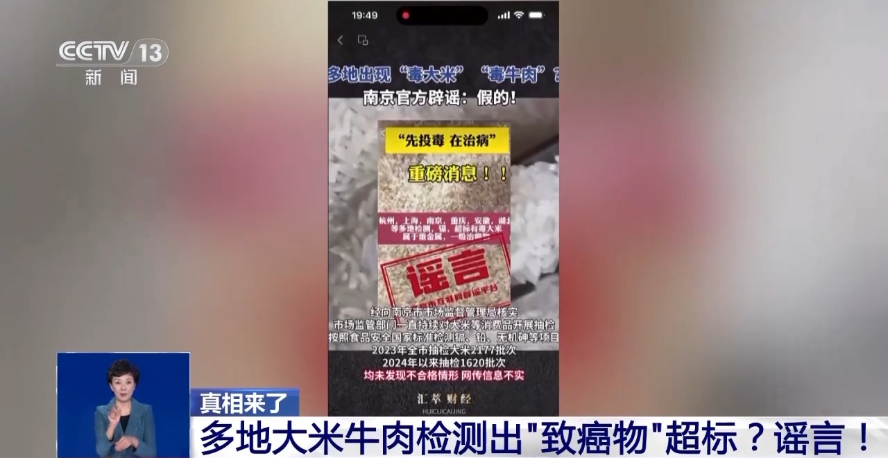 近日,有網民先後在網絡平台發佈視頻稱,南京等地大米被檢測出重金屬“鎘”超標,多地牛肉被檢測出獸藥“恩諾沙星”超標288倍,並聲稱二者均系“一級致癌物”。經南京網信部門向當地市場監督管理局和農業農村局核實,監管部門一直按照國家標準對抽檢大米進行鎘、鉛、無機砷等項目檢測,均未發現不合格情形。今年以來,對屠宰場和流通環節牛肉的抽檢全部合格。上述兩則網絡傳言均不實。