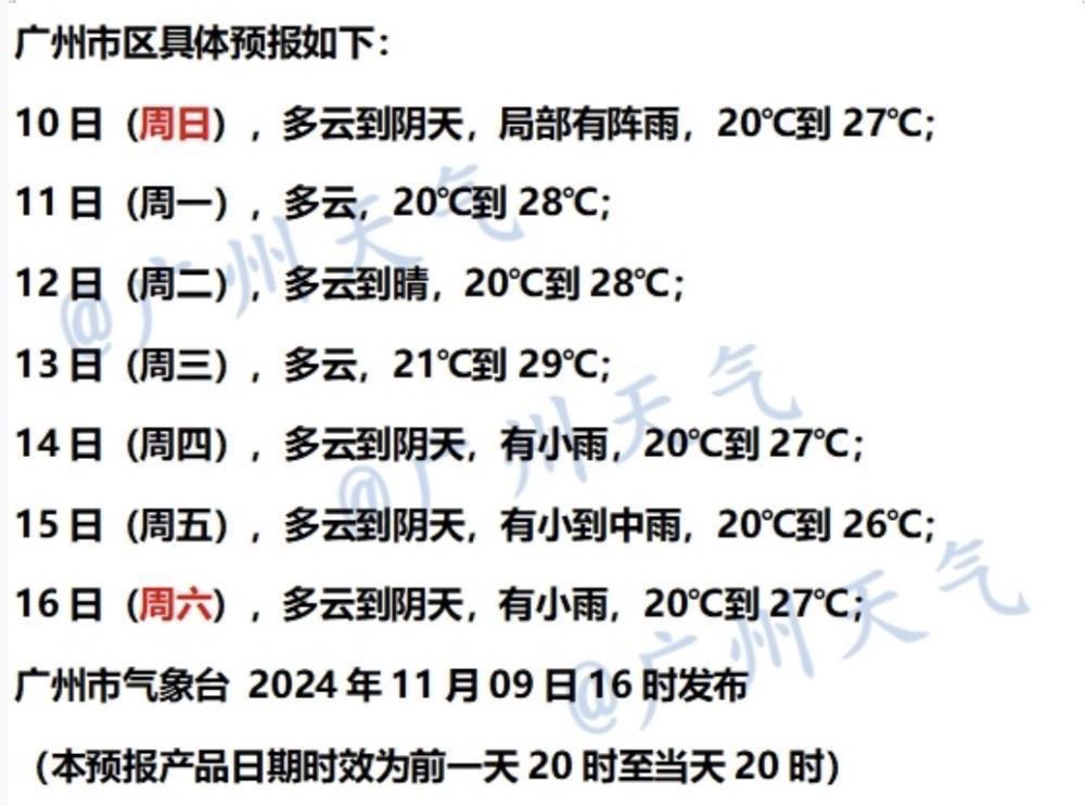 預計11月11日至13日廣州以多雲間晴為主,氣温回升,11月14日起轉多雲到陰天有小到中雨。從氣温變化看,11月10日至16日,廣州市區日最低氣温介於20℃~21℃,日最高氣温介於26℃~29℃。