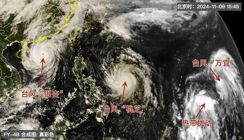 11月9日15時45分,颱風“銀杏”“桃芝”“萬宜”的“合影”。國家衞星氣象中心風雲四號衞星天氣應用平台截圖
