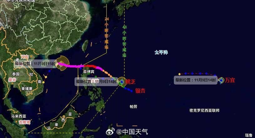中央氣象台觀測,“桃芝”11月9日14時中心位於菲律賓馬尼拉偏東方向約1110公里的洋麪上,中心附近最大風力8級(18米/秒)。預計“桃芝”將以每小時25公里左右的速度向西偏北方向移動,強度逐漸增強,並向菲律賓呂宋島以東洋麪靠近,11月11日白天將在上述沿海登陸。