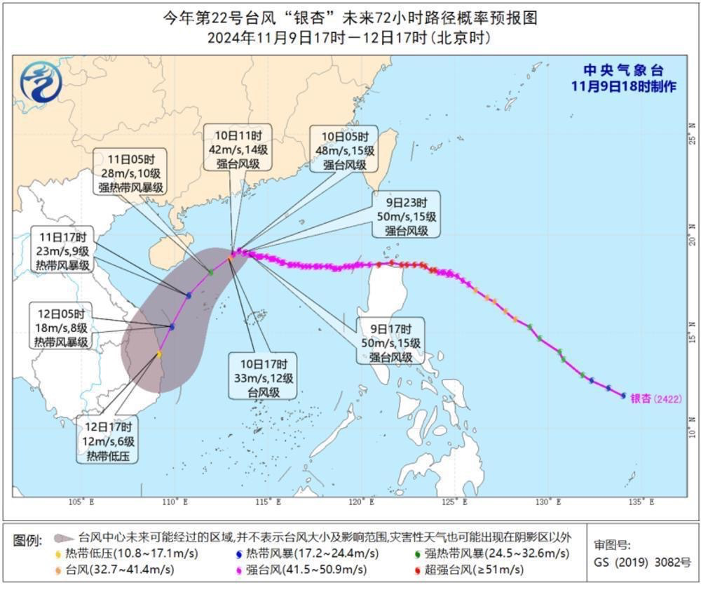 中央氣象台11月9日18時對“銀杏”的路徑和強度預報