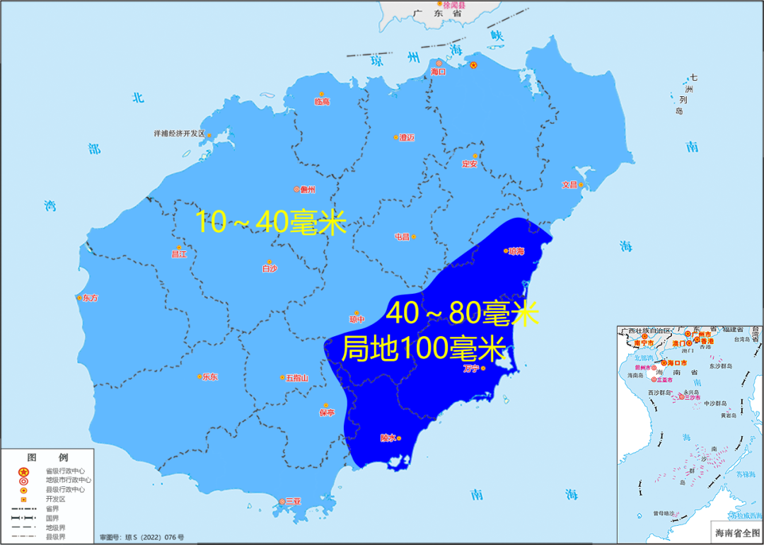 預計,10日08時~12日08時各地累積雨量:海南島瓊海、萬寧、瓊中和陵水等市縣40~80毫米、局地100毫米;其餘市縣10~40毫米。西沙和中沙羣島各島礁累積雨量40~80毫米。