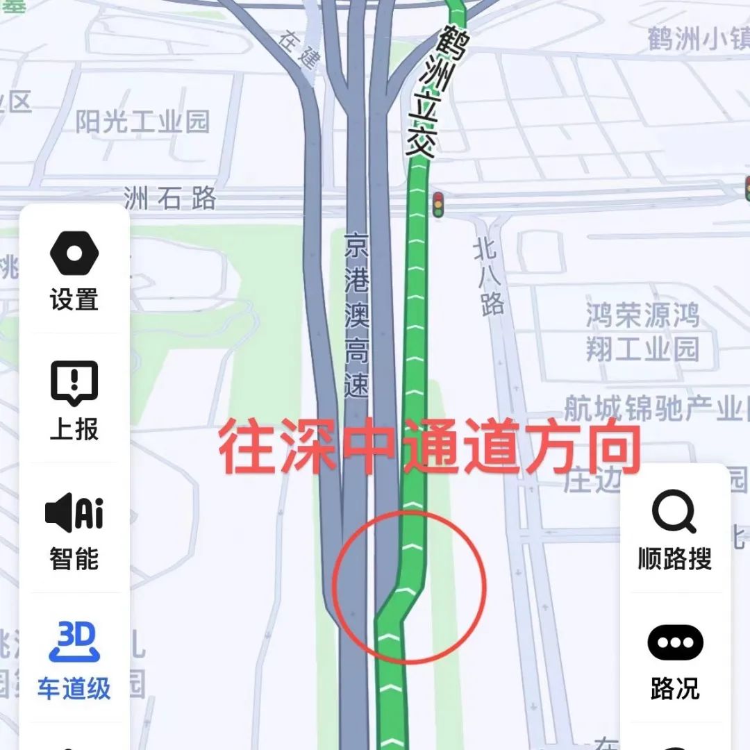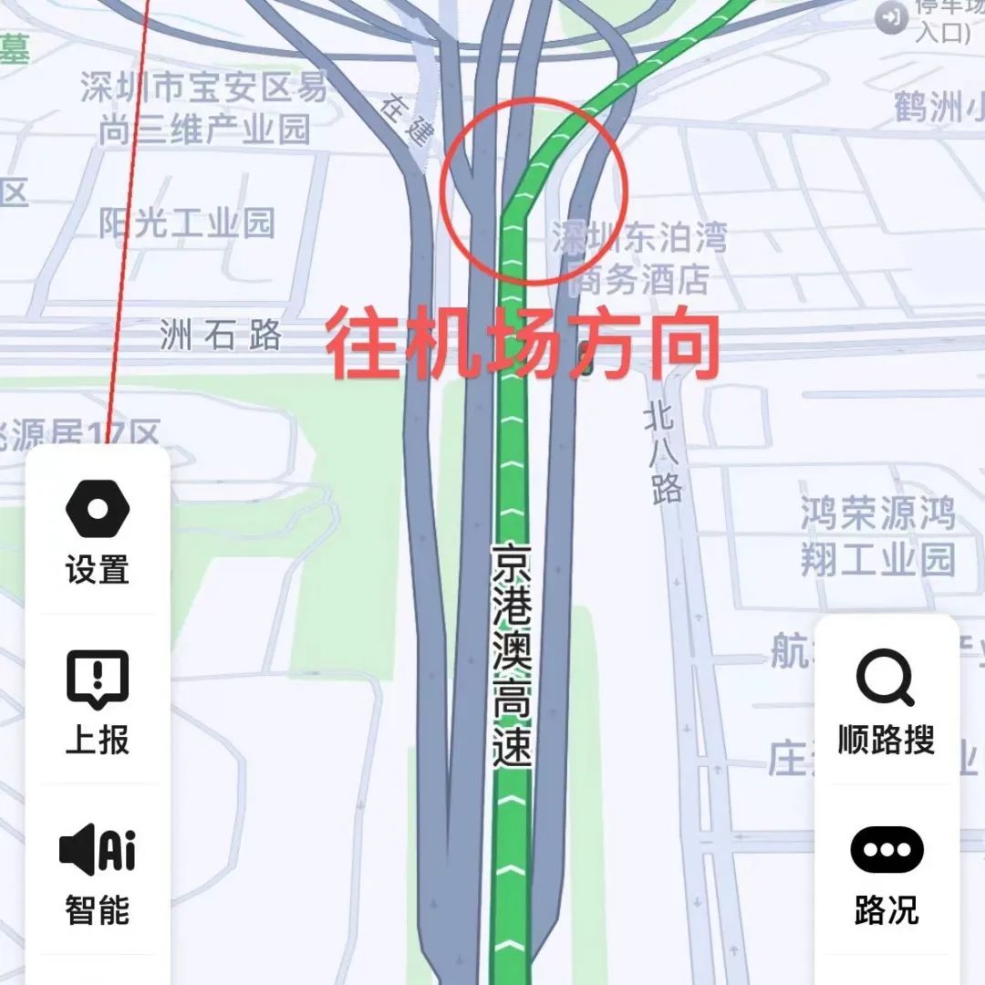 自駕從廣深高速往機場方向行駛的駕駛員請注意,此處路段有兩個匝道口,往深中通道方向 的在前 ,往機場方向 的在後 。途經此處時,請按路標或按導航行駛,提前做好變道準備。