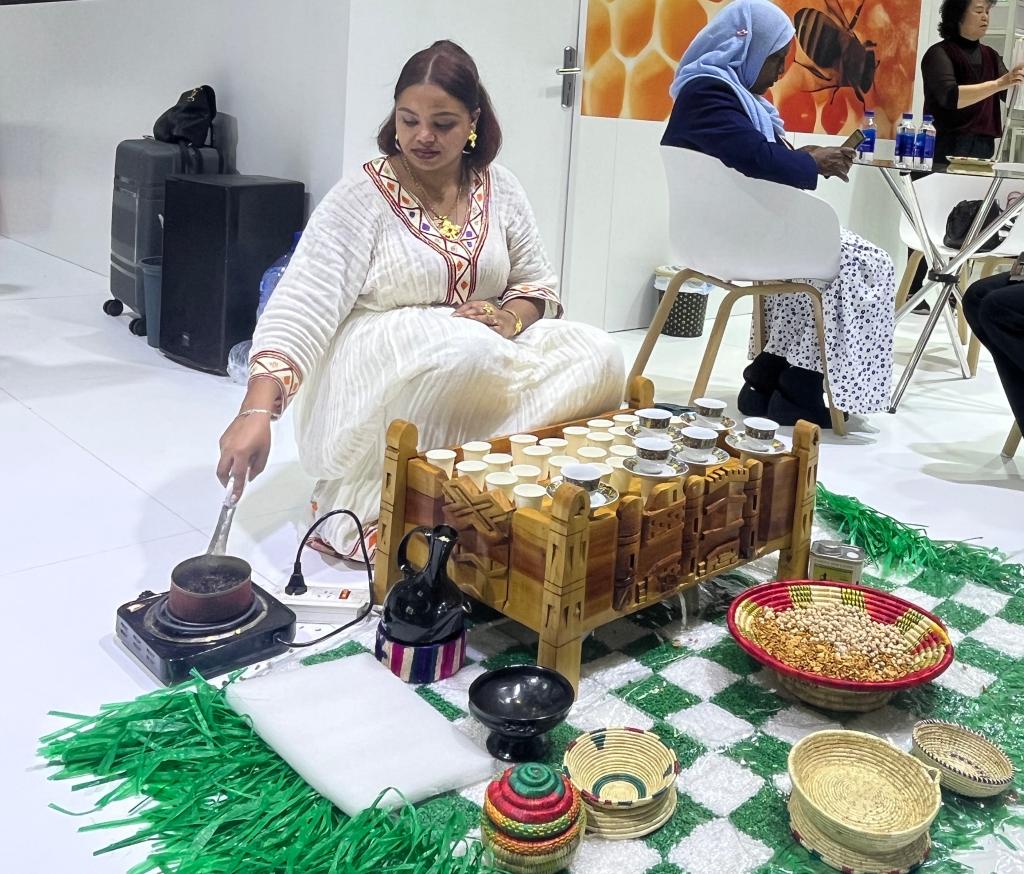 在埃塞俄比亞國家館展區,埃塞俄比亞咖啡師在現場烘焙咖啡豆,展示當地咖啡文化。(受訪者供圖)