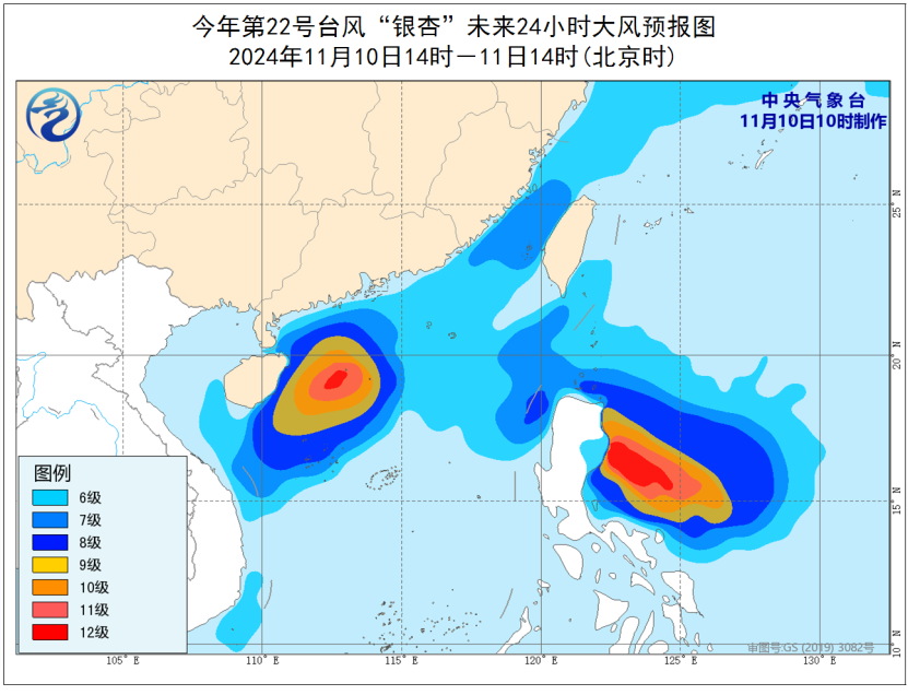 中央氣象台11月10日10時繼續發佈颱風黃色預警:預計10日14時至11日14時,受冷空氣和颱風“銀杏”的共同影響,台灣海峽、南海北部和中部、巴士海峽、西沙羣島、瓊州海峽、海南島東部沿海、福建沿海、廣東沿海將有6~8級、陣風9~10級的大風,其中南海西北部和中西部的部分海域風力可達9*~11級、陣風12~13級,“銀杏”中心經過的附近海域風力可達12*~13級,陣風14~15級。