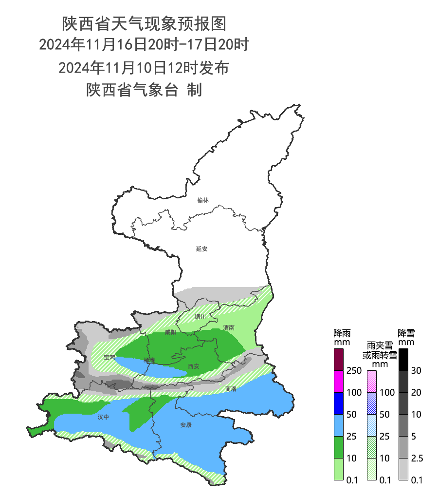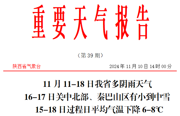 11月11-13日受短波槽東移影響,*我省大部有小雨,陝北部分、關中西部及南部、陝南東部有中雨,局地大雨。*11月14日降水減弱,陝北南部、陝南南部有分散性小雨。11月15-18日受較強冷空氣和短波槽共同影響,我省中南部將出現持續性降水、降温天氣過程,*陝北南部小雨轉雨夾雪或小雪,關中南部、陝南有中雨,關中南部局地、陝南部分地方有大雨,關中北部、秦巴山區有雨夾雪或小到中雪,*降水期間能見度較低。11月15-18日過程日平均氣温全省大部下降6~8℃,局地10℃以上,預計最低氣温出現在11月19日清晨;14-19日中北部部分地方有霜凍。17-19日關中西部及北部、秦巴山區有道路結冰。